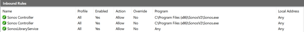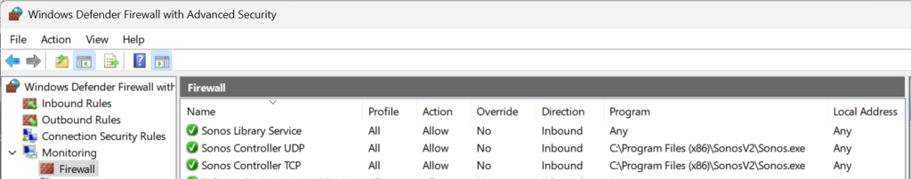 The first annoying thing you’ll see when trying to use Sonos on Windows is this message. You’ll see this if you’ve set “Allow local policy merge” to False. This means Intune is the source of truth for firewall rules and the locally created rule by the Sonos installer is ignored.