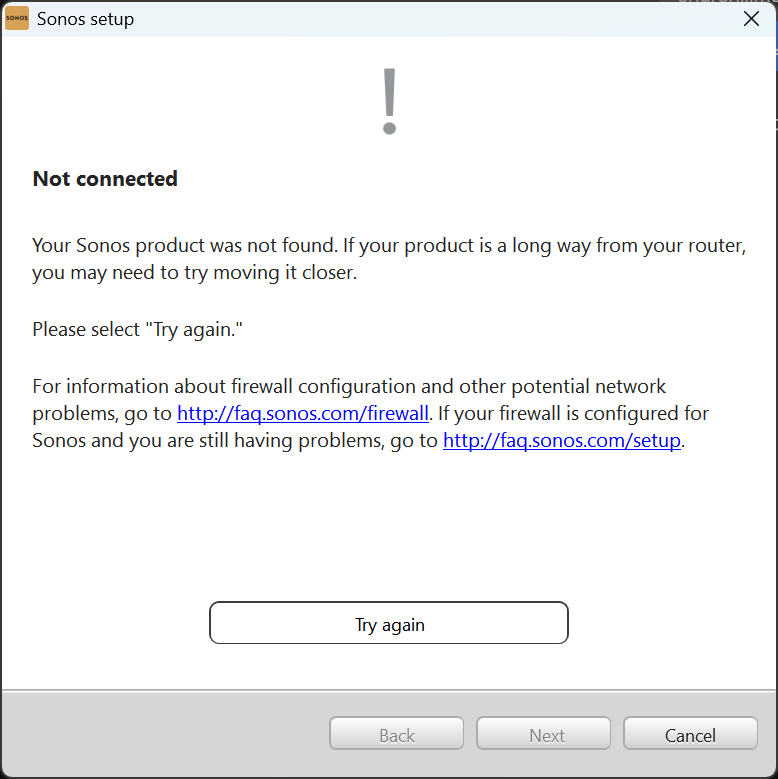 The first annoying thing you'll see when trying to use Sonos on Windows is this message. You'll see this if you've set "Allow local policy merge" to False. This means Intune is the source of truth for firewall rules and the locally created rule by the Sonos installer is ignored.