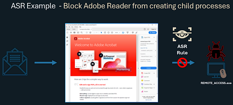 What the ASR rule "Block Adobe Reader from creating child processes" is designed to do, is stop the behaviour of that action entirely. I think this is pretty cool.