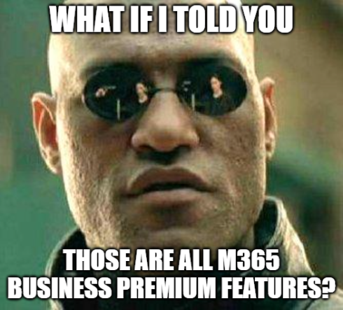 Some of the Business Premium flavours of those features are the starting point in the Microsoft stack, for example the web content filtering won't let you have different blocking groups by devices etc. But the main point here is that BP is the baseline suite of products for a good security posture. We haven't even got onto identity protection yet.